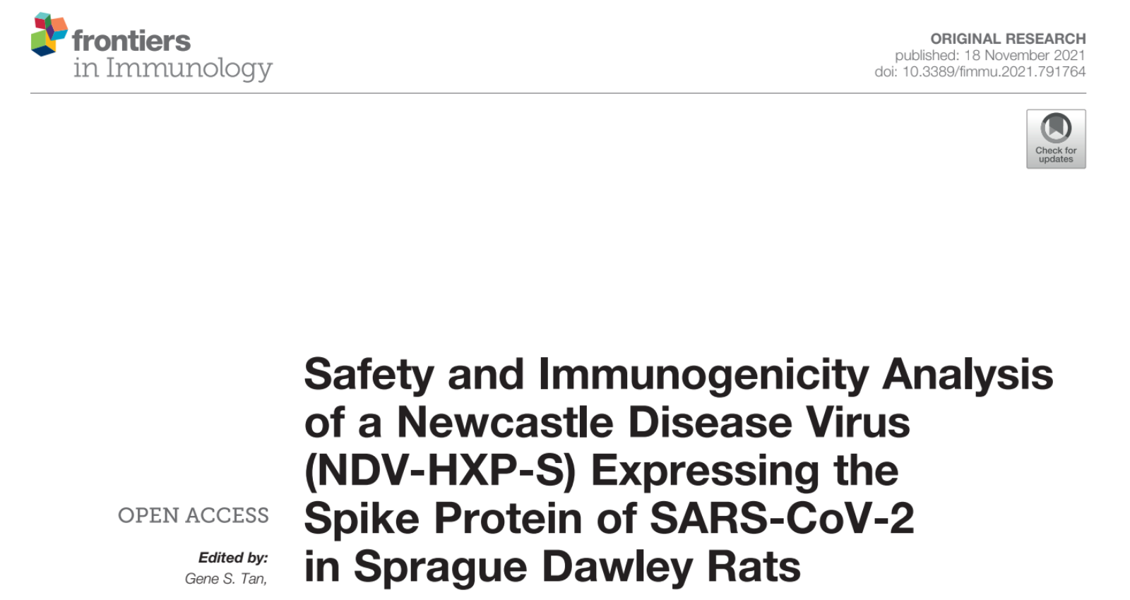 Tcheou J, Raskin A, Singh G, Kawabata H, Bielak D, Sun W, González-Domínguez I, Sather DN, García-Sastre A, Palese P, Krammer F and Carreño JM (2021) Safety and Immunogenicity Analysis of a Newcastle Disease Virus (NDV-HXP-S) Expressing the Spike Protein of SARS-CoV-2 in Sprague Dawley Rats. Front. Immunol. 12:791764. doi: 10.3389/fimmu.2021.791764