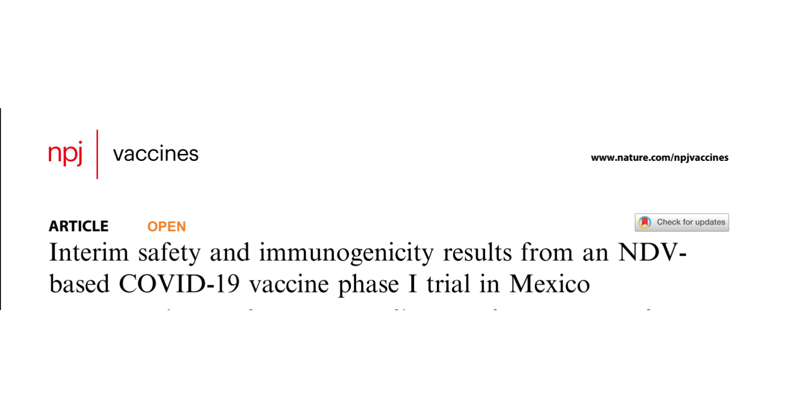 Ponce-de-León S, Torres M, Soto-Ramírez LE, Calva JJ, Santillán-Doherty P, Carranza-Salazar DE, Carreño JM, Carranza C, Juárez E, Carreto-Binaghi LE, Ramírez-Martínez L, Paz De la Rosa G, Vigueras-Moreno R, Ortiz-Stern A, López-Vidal Y, Macías AE, Torres-Flores J, Rojas-Martínez O, Suárez-Martínez A, Peralta-Sánchez G, Kawabata H, González-Domínguez I, Martínez-Guevara JL, Sun W, Sarfati-Mizrahi D, Soto-Priante E, Chagoya-Cortés HE, López-Macías C, Castro-Peralta F, Palese P, García-Sastre A, Krammer F, Lozano-Dubernard B. Interim safety and immunogenicity results from an NDV-based COVID-19 vaccine phase I trial in Mexico. NPJ Vaccines. 2023 May 10;8(1):67. doi: 10.1038/s41541-023-00662-6. PMID: 37164959; PMCID: PMC10170424.